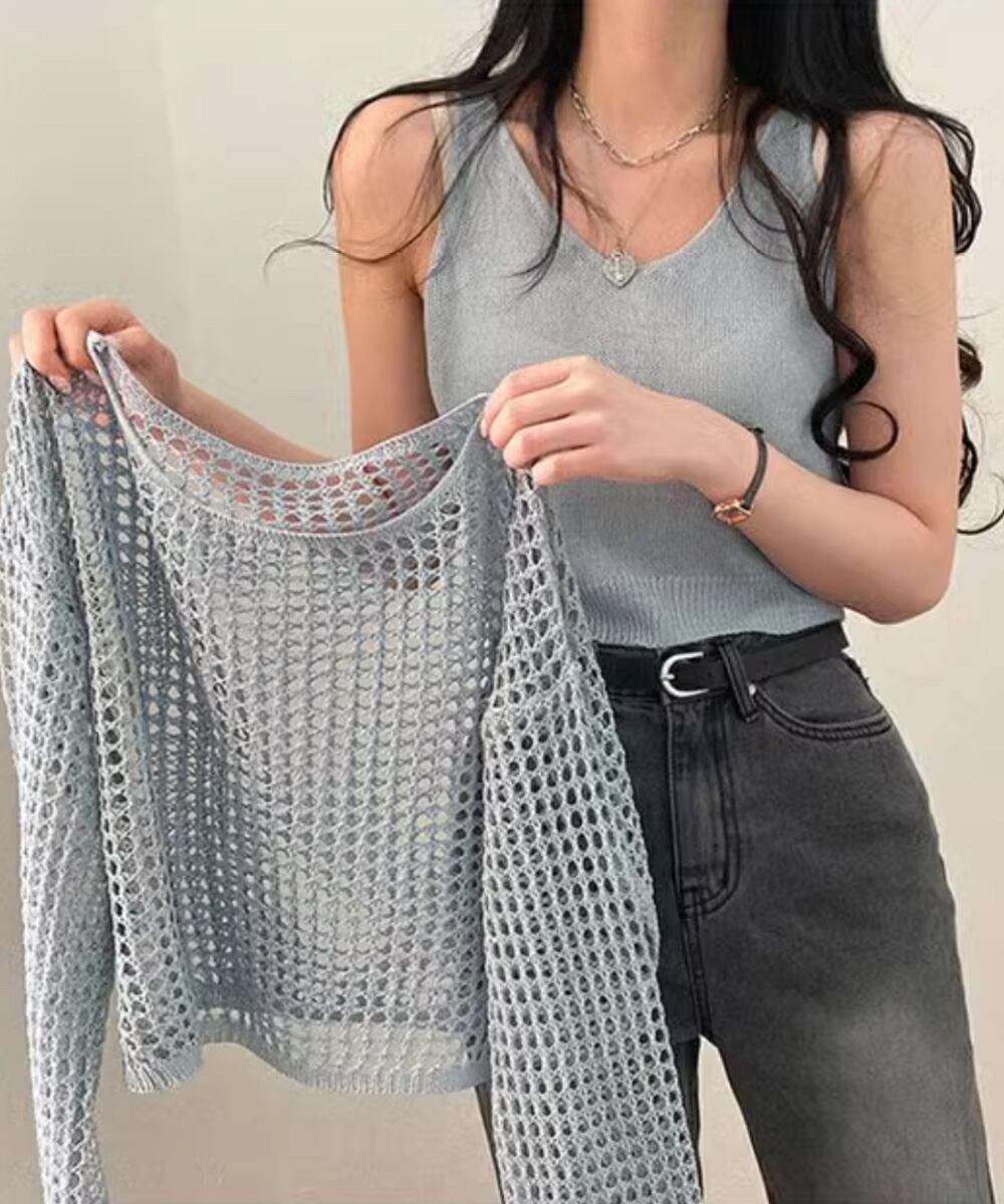 ショート丈ニットトップス セットアップ 透かし編みトップス ニットキャミ 体型カバーニットアンサンブル カジュアル韓国風