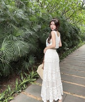 透かし編みビスチェ ロングスカート レディース サマーニット2点セットフリンジタンクトップ フレアスカート ビーチウェア