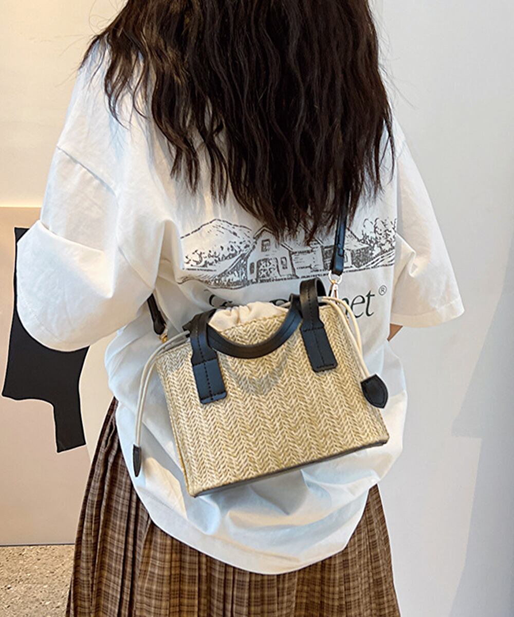 夏っぽい麦わら素材とフェイクレザーがカジュアルになり過ぎず、小さめで持ち運びも楽々