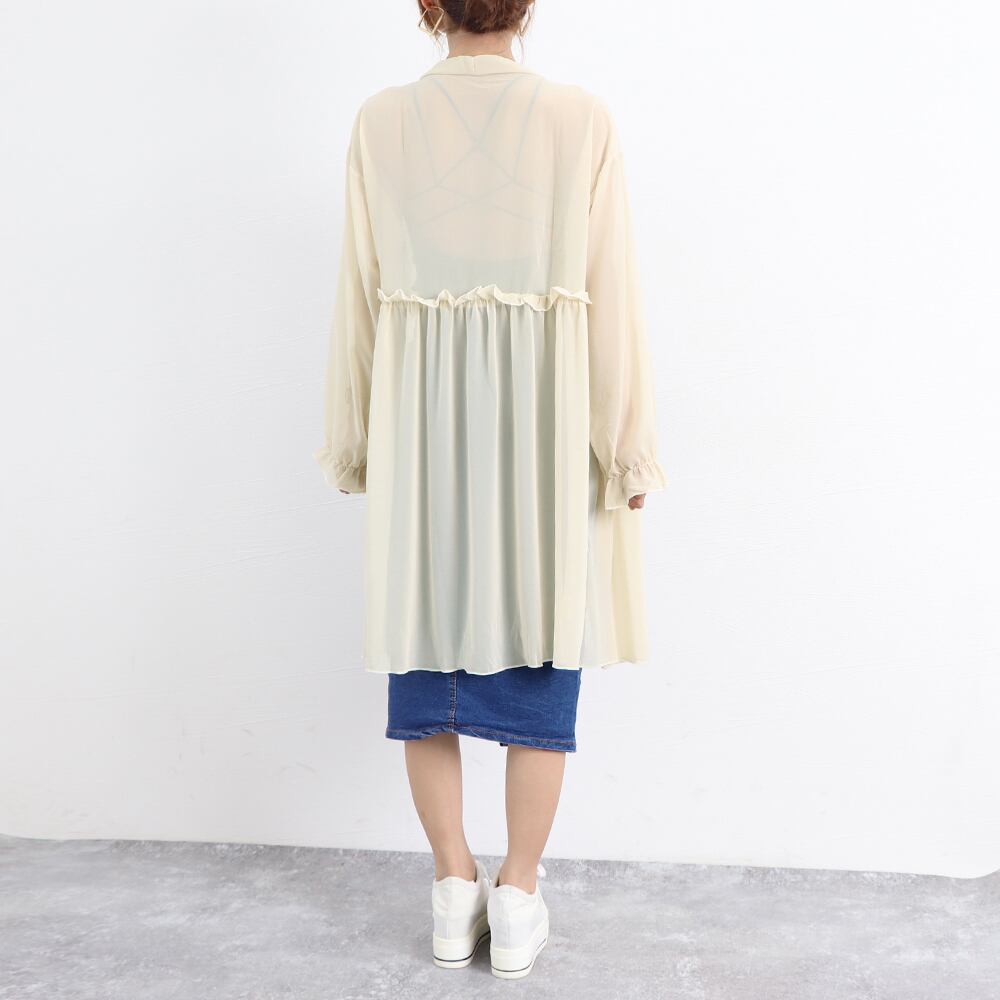 ウエストはたっぷりのギャザーとふんわり広がるフレアなシルエットが魅力的なロングサマーカーディガン