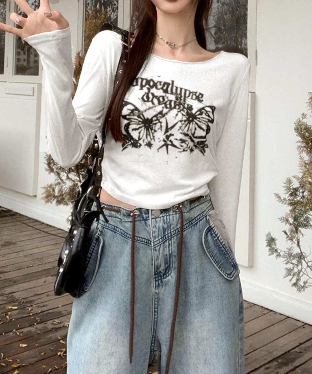 レディース 長袖 ショート丈トップス カットソー 薄手 プルオーバー カジュアル プリントtシャツ 韓国風ファッション