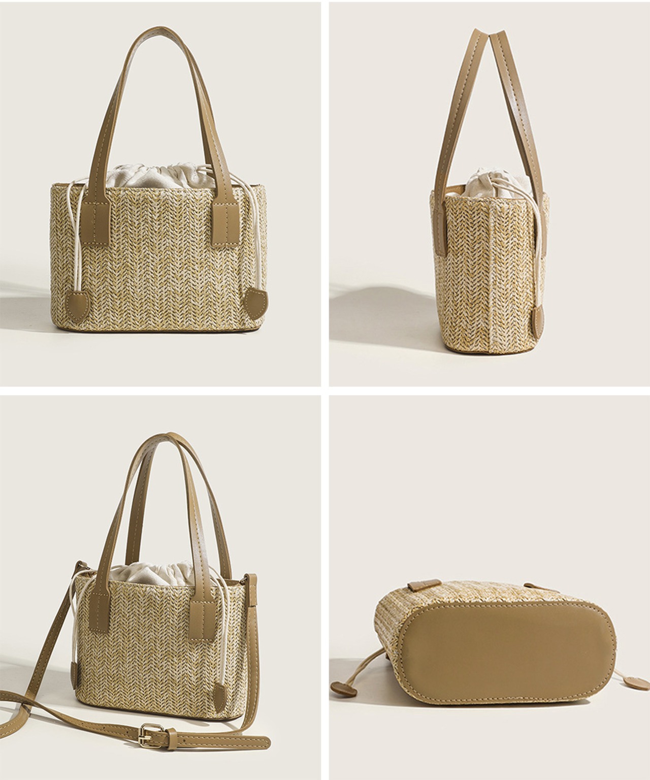 夏っぽい麦わら素材とフェイクレザーがカジュアルになり過ぎず、小さめで持ち運びも楽々