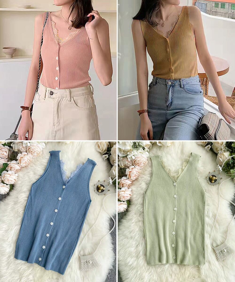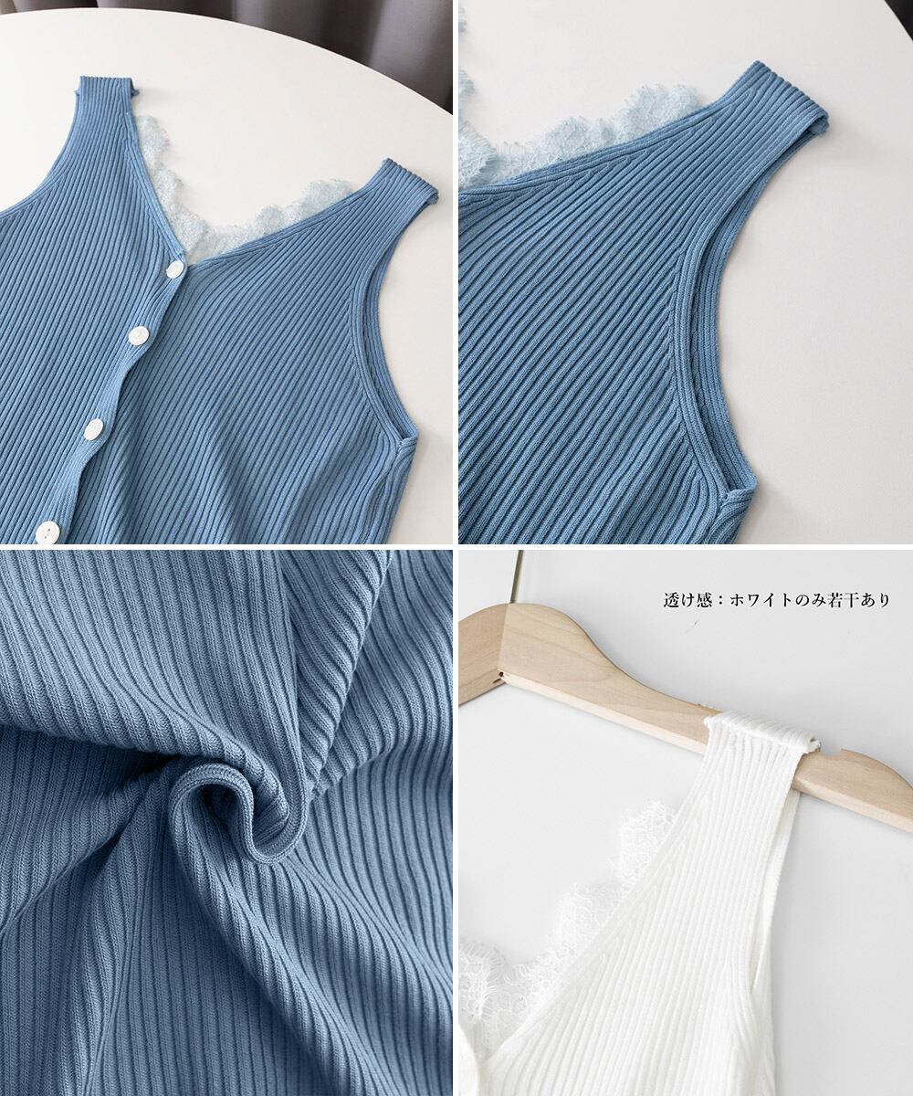 レディース 前開き ノースリーブニット カラバリ豊富 Vネックサマーニット レース切り替え 涼しいインナートップス韓国風