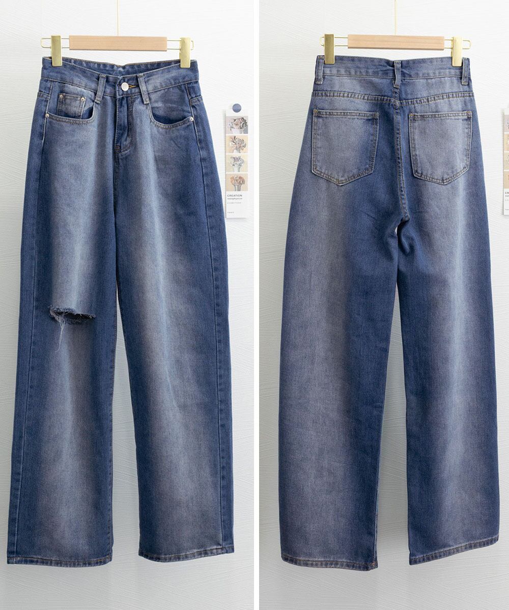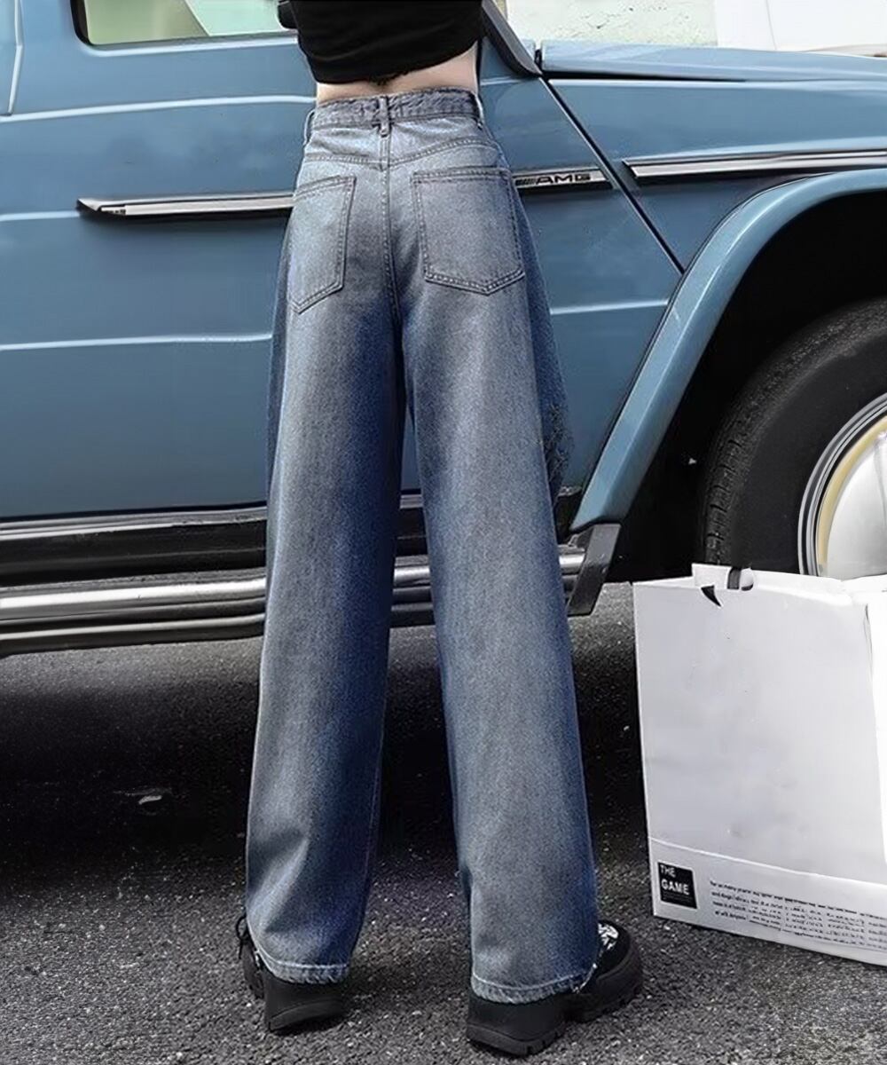 レディース ハイウエスト ストレートパンツ 着やせロングパンツ ゆったり ウォッシュジーンズ カットアウト デニムパンツ